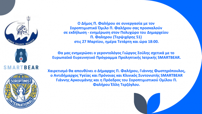 Ο Δήμος Παλαιού Φαλήρου και ο Σοροπτιμιστικός Όμιλος Παλαιού Φαλήρου σας καλούν  σε ανοιχτή ενημερωτική εκδήλωση του ερευνητικού προγράμματος Smart Bear , που θα πραγματοποιηθεί την Τετάρτη 27/3 στον Πολυχώρο του Δημαρχείου στις 18:00.