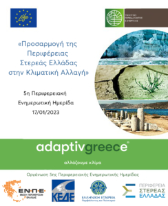Πρόκειται για την 5η Περιφερειακή Ενημερωτική Ημερίδα, που διοργανώνεται στο πλαίσιο του έργου LIFE-IP AdaptInGR και επιδιώκει την ενημέρωση και ευαισθητοποίηση των πολιτών της Στερεάς Ελλάδας, σχετικά με τις επιπτώσεις της κλιματικής αλλαγής (ευάλωτοι θεματικοί τομείς, τρόποι για καλύτερη προσαρμογή).