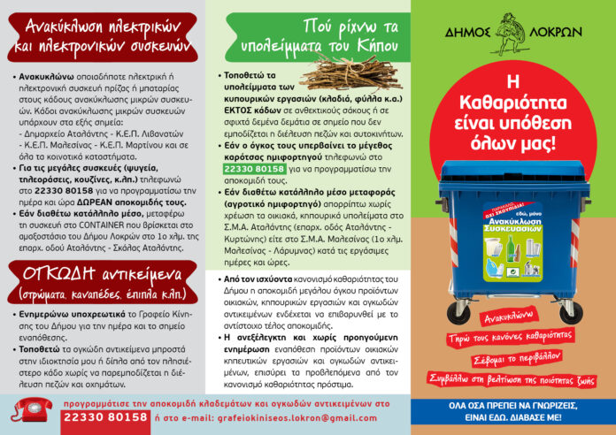 Το φυλλάδιο για την ανακύκλωση αλλά και για τους βασικούς κανόνες καθαριότητας θα αποστείλει ο Δήμος Λοκρών  στα σπίτια όλων των δημοτών είτε μέσω email είτε μέσω των προσεχών λογαριασμών ύδρευσης, παρέχοντας  συνοπτικές οδηγίες  για την ανακύκλωση, τον  σωστό διαχωρισμό των απορριμμάτων στην πηγή, την επιλογή του κατάλληλου κάδου, αλλά και τη σωστή διαχείριση των υπόλοιπων απορριμμάτων.