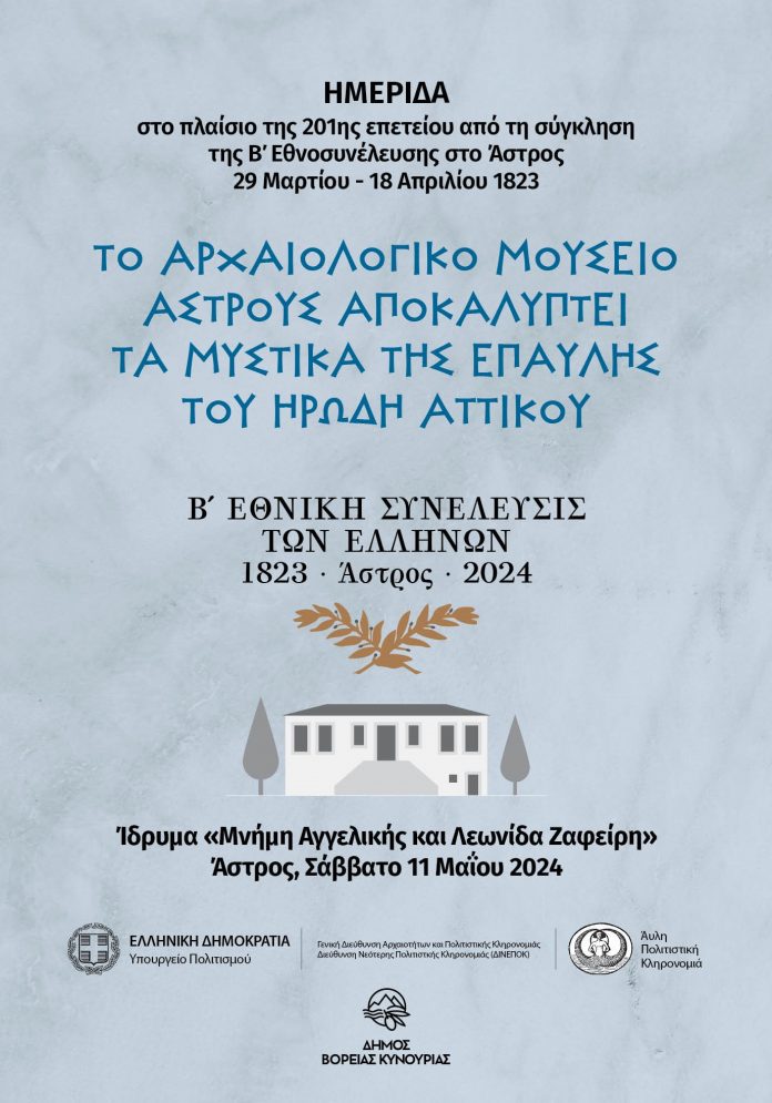Με την Επιστημονική Ημερίδα «Το Αρχαιολογικό Μουσείο Άστρους αποκαλύπτει τα μυστικά της Έπαυλης του Ηρώδη Αττικού», ολοκληρώνονται το Σάββατο 11 Μαΐου οι εκδηλώσεις του Δήμου Βόρειας Κυνουρίας στο πλαίσιο του εορτασμού της 201ης επετείου από τη σύγκληση της Β’ Εθνοσυνέλευσης των Ελλήνων στο Άστρος το 1823.