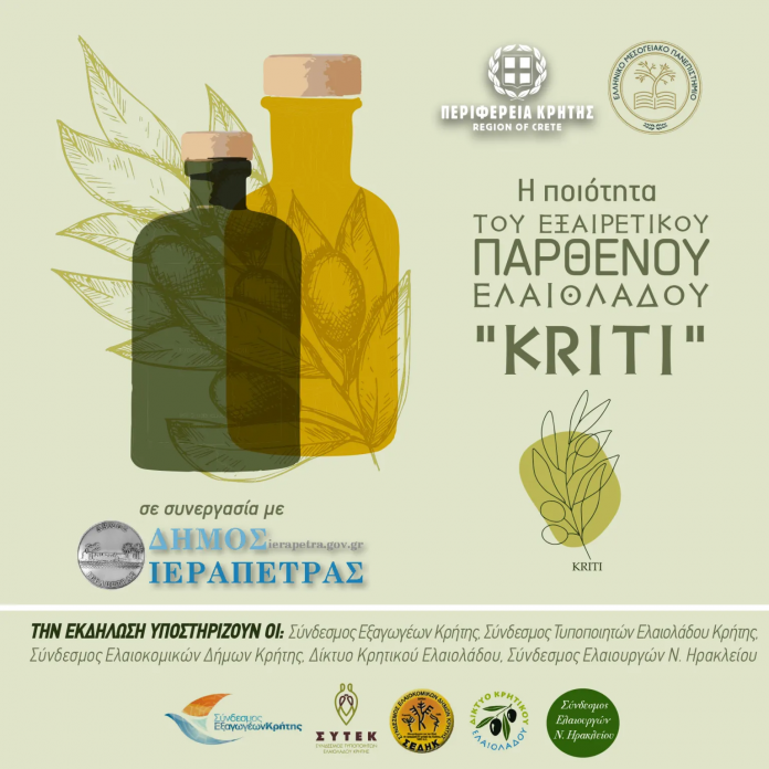 Η Περιφέρεια Κρήτης και το Ελληνικό Μεσογειακό Πανεπιστήμιο, σε συνεργασία με το Δήμο Ιεράπετρας, διοργανώνουν εσπερίδα για την ποιότητα του Εξαιρετικού Παρθένου Ελαιόλαδου “Kriti” η οποία θα πραγματοποιηθεί την Παρασκευή 31 Μαΐου 2024, στις 17:00, στην Μικρή Αίθουσα «Μελίνα Μερκούρη» στο Δημαρχείο Ιεράπετρας. Με την υποστήριξη των: Σύνδεσμος Εξαγωγέων Κρήτης, Σύνδεσμος Τυποποιητών Ελαιολάδου Κρήτης, Σύνδεσμος Ελαιοκομικών Δήμων Κρήτης, Δίκτυο Κρητικού Ελαιολάδου, Σύνδεσμος Ελαιουργών Ν. Ηρακλείου.