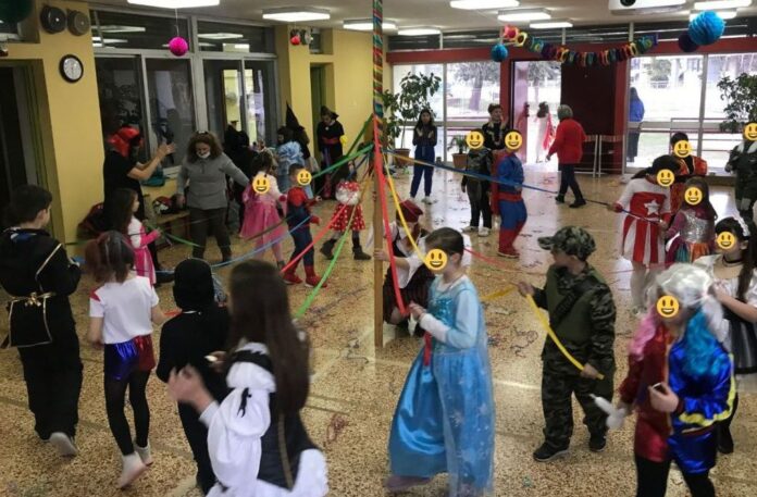 Οι μαθητές του ΚΔΑΠ και οι παιδαγωγοί μεταμφιεσμένοι, ένιωσαν τη μαγεία της Αποκριάς με το μουντζούρωμα, το κυνήγι των λουκουμιών και το παραδοσιακό παιχνίδι του βρασμένου αΒγού (χάσκα).