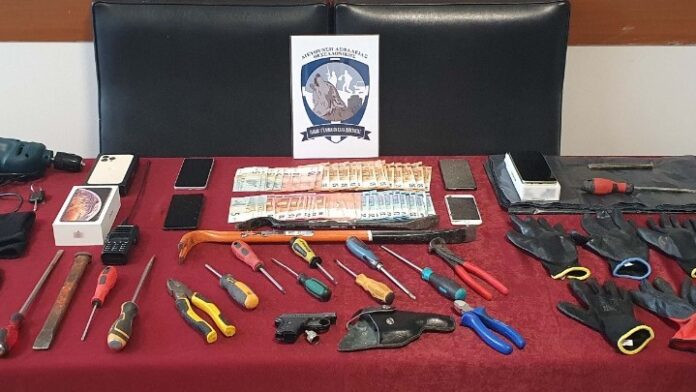 Σε κατ’ οίκον έρευνες κατασχέθηκαν -μεταξύ άλλων- χρηματικά ποσά, διαρρηκτικά εργαλεία, ένας φορητός πομποδέκτης συντονισμένος στις συχνότητες της ΕΛ.ΑΣ., 230 ναρκωτικά χάπια, ένα πιστόλι κρότου και δύο αυτοκίνητα.