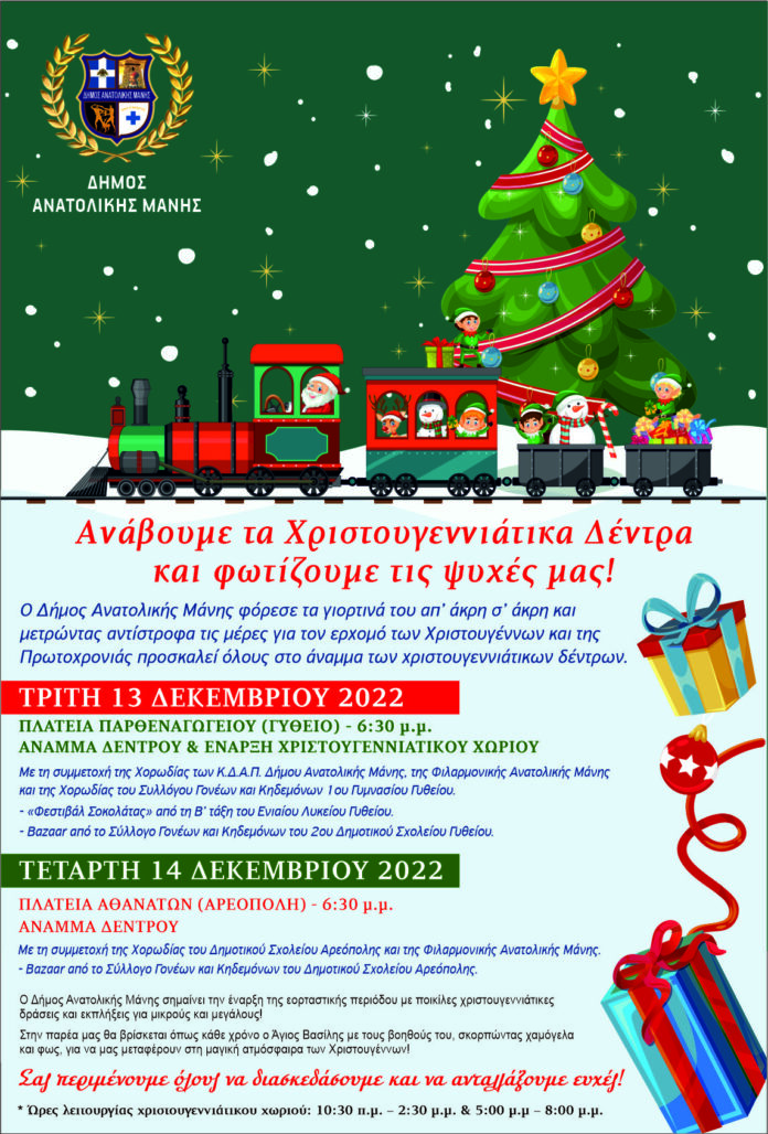 Ο Δήμος Ανατολικής Μάνης φόρεσε τα γιορτινά του απ’ άκρη σ’ άκρη και μετρώντας αντίστροφα τις μέρες για τον ερχομό των Χριστουγέννων και της Πρωτοχρονιάς προσκαλεί όλους στο άναμμα των χριστουγεννιάτικων δέντρων.