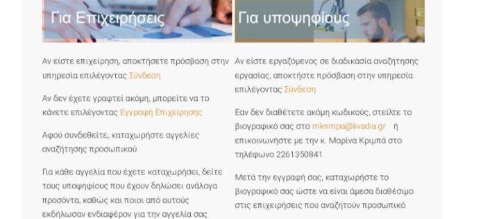 H εφαρμογή αυτή δίνει την δυνατότητα στις επιχειρήσεις να υποβάλλουν αγγελίες αναζήτησης  προσωπικού με στόχο την εύρεση στελεχιακού δυναμικού, σύμφωνα με τις ανάγκες τους.