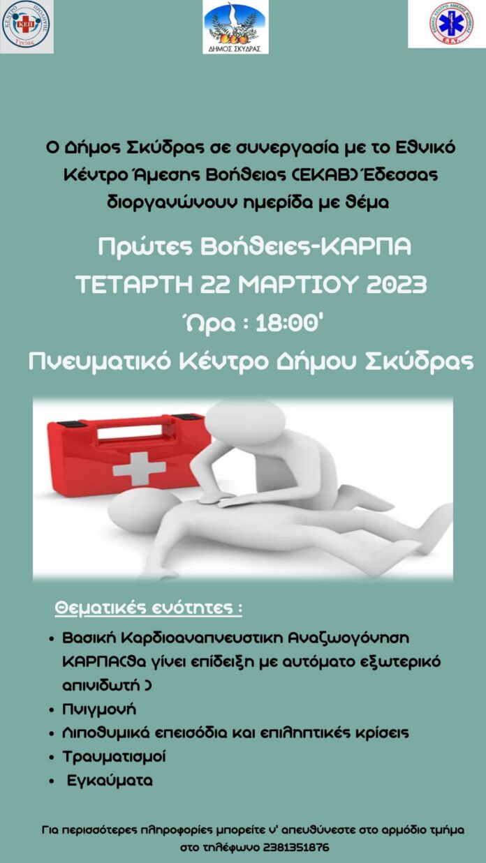 Ο Δήμος Σκύδρας μέσω του Κέντρου Πρόληψης (ΚΕ.Π.) Υγείας και το Εθνικό Κέντρο Άμεσης Βοήθειας (Ε.Κ.Α.Β.) Έδεσσας διοργανώνουν ημερίδα με θέμα: