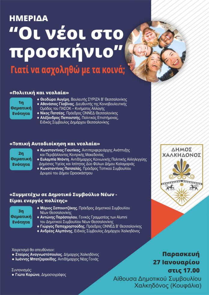 Ημερίδα με θέμα “Οι νέοι στο προσκήνιο -Γιατί να ασχοληθώ με τα κοινά;” διοργανώνει ο Δήμος Χαλκηδόνος την Παρασκευή 27 Ιανουαρίου 2023 στις 5 το απόγευμα στην αίθουσα του Δημοτικού Συμβουλίου Χαλκηδόνος, στα Κουφάλια.