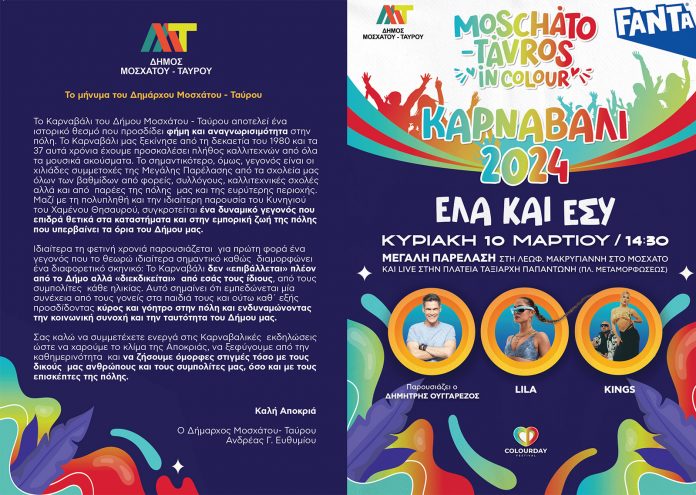 Οι εκδηλώσεις για το «Καρναβάλι 2024» του Δήμου Μοσχάτου-Ταύρου έχουν ήδη ξεκινήσει. Το φετινό πρόγραμμα περιλαμβάνει δράσεις και εκδηλώσεις για μικρούς και μεγάλους, ενώ οι εκδηλώσεις κορυφώνονται με την μεγάλη παρέλαση του Καρναβαλιού, την Κυριακή, 10 Μαρτίου, στις 14.30 στη Λ. Μακρυγιάννη στο Μοσχάτο με τη συμμετοχή 6.000 καρναβαλιστών και αρμάτων, τη νεανική συναυλία με τη LILA TRIANTI και τους KINGS, αλλά και το Colour Day Festival που για άλλη μία χρονιά θα δώσει χρώμα στη γιορτή μας.