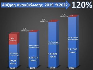 Σε ποσοστό 120%, αυξήθηκε το ποσοστό ανακύκλωσης συσκευασιών στον Δήμο Αιγιαλείας από το Σεπτέμβριο του 2019 έως και τον Δεκέμβριο του 2022, ενώ το καθαρό ανακυκλώσιμο προϊόν αγγίζει το 100%, σε αντίθεση με το 2019, που το υπόλειμμα έφτανε το 45% του γενικού όγκου των ανακυκλώσιμων απορριμμάτων.