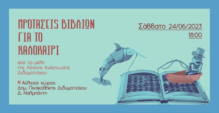 Το Σάββατο στις 24/06/2023 και ώρα 18:00 θα πραγματοποιηθεί η δράση “Προτάσεις βιβλίων για το καλοκαίρι” από τα μέλη της Λέσχης Ανάγνωσης Διδυμοτείχου, Μαυρομάτη Μαρία (συντονίστρια λέσχης) και Καραγιώργου Μαρία-Λουΐζα (μέλος), στον αύλειο χώρο της Δημοτικής Πινακοθήκης Διδυμοτείχου “Δημητρίου Ναλμπάντη”.