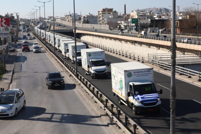 Με 50 οχήματα της Περιφέρειας Αττικής ξεκίνησε από το ΣΕΦ το κομβόι της ανθρωπιστικής βοήθειας προς τους σεισμόπληκτους της Τουρκίας