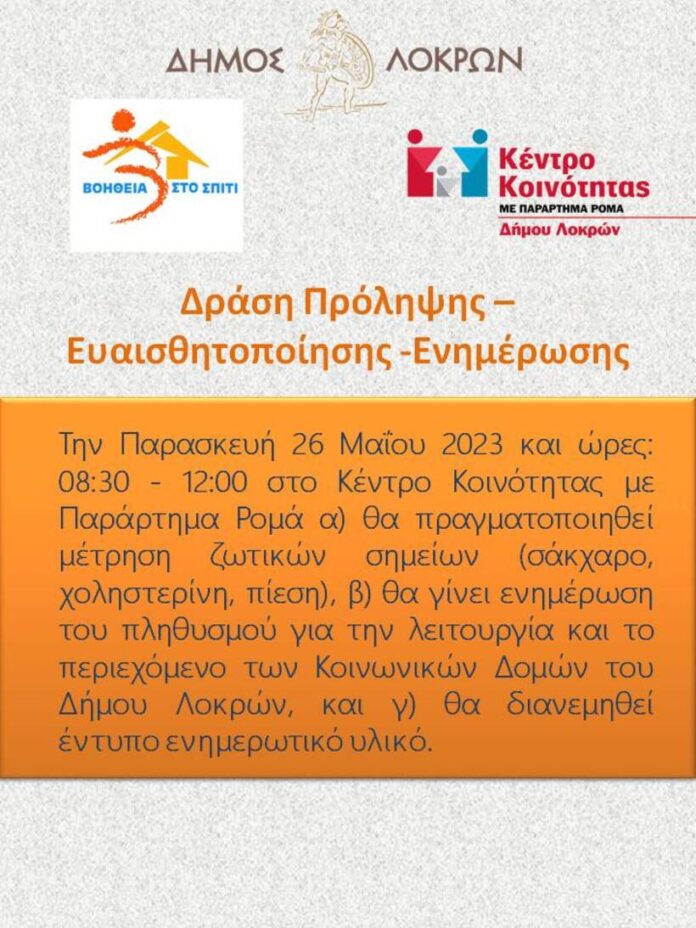 Μετρήσεις ζωτικών οργάνων την Παρασκευή 26 Μαΐου 2023 μεταξύ 08:30-12:00 στο Κέντρο Κοινότητας με Παράρτημα Ρομά Αταλάντης του Δήμου Λοκρών