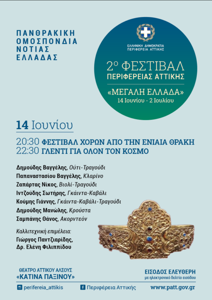 Μια μεγάλη αγκαλιά για όλους τους πολιτιστικούς συλλόγους της Αττικής ανοίγει η Περιφέρεια Αττικής από σήμερα 14 Ιουνίου μέχρι και τις 2 Ιουλίου στο Θέατρο «Κατίνα Παξινού» του Αττικού Άλσους, στο πλαίσιο του 2ου Φεστιβάλ Περιφέρειας Αττικής.