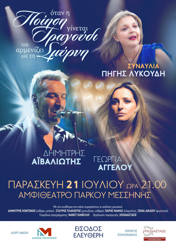 Με τη μουσική εκδήλωση «Όταν η ποίηση γίνεται τραγούδι και αρμενίζει ως τη Σμύρνη», συνεχίζονται την Παρασκευή 21 Ιουλίου, στις 9 μ.μ. στο αμφιθέατρο του πάρκου Μεσσήνης, οι εκδηλώσεις του πολιτιστικού καλοκαιριού του Δήμου Μεσσήνης 2023.