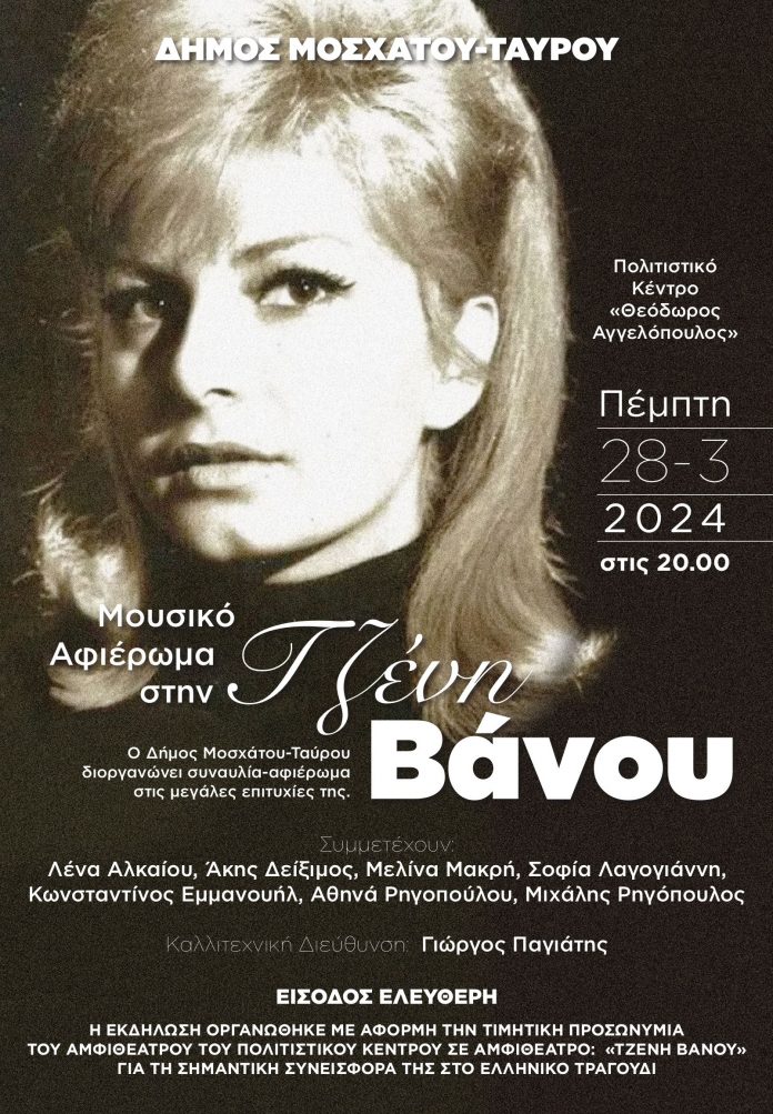 Μουσικό αφιέρωμα στην Τζένη Βάνου από τον Δήμο Μοσχάτου-Ταύρου, την Πέμπτη 28 Μαρτίου 2024 και τιμητική προσωνυμία του Αμφιθεάτρου του Πολιτιστικού Κέντρου Μοσχάτου σε Αμφιθέατρο «Τζένη Βάνου»