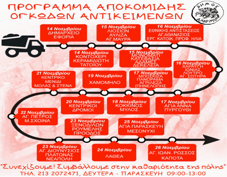 Ο Δήμος Αχαρνών στο πλαίσιο της καλύτερης ενημέρωσης των Δημοτών δημοσιοποιεί το νέο πρόγραμμα αποκομιδής ογκωδών αντικειμένων. Επτά ημέρες την εβδομάδα τα συνεργεία του Δήμου δίνουν τον δικό τους αγώνα για την εξασφάλιση ενός βιώσιμου και υγιούς περιβάλλοντος.
