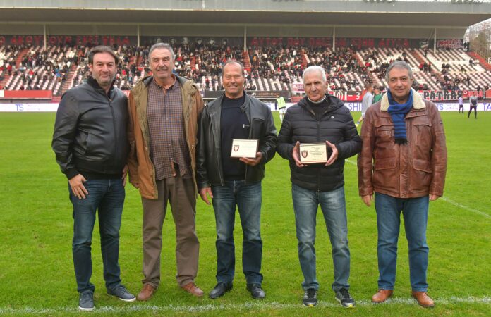 Στο ημίχρονο του αγώνα και στο πλαίσιο βραβεύσεων παλαιμάχων παικτών της, που έχει καθιερώσει η Παναχαϊκή, ο Αντιδήμαρχος απένειμε τιμητική πλακέτα στον Γρηγόρη Πλιάτσικα, έναν από τους σημαντικότερους τερματοφύλακες που φόρεσαν και δόξασαν την κοκκινόμαυρη φανέλα, ενώ τιμητική πλακέτα απένειμε και στον Σωτήρη Αυγερινόπουλο μεγάλη δόξα του Συλλόγου, ο Διοικητής της 6ης ΥΠΕ Σωτήρης Καρβέλης.
