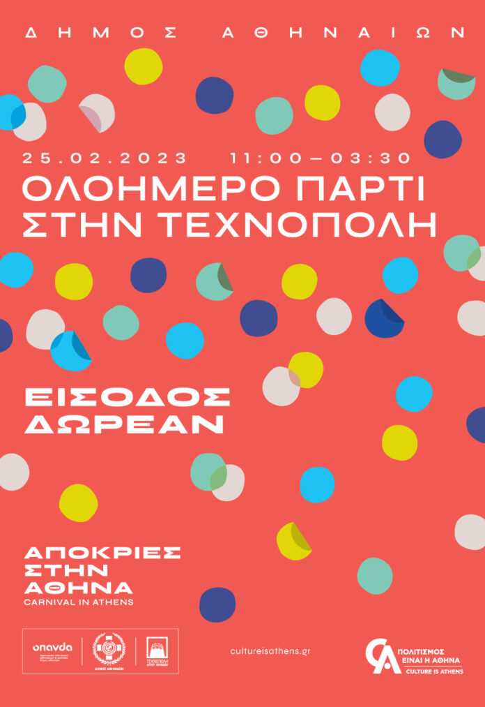 Και φέτος τις Απόκριες, ο Δήμος Αθηναίων διοργανώνει τη μεγαλύτερη γιορτή του καρναβαλιού σε όλη την πόλη και μας καλεί να γλεντήσουμε παρέα στο κέντρο και στις γειτονιές! Το Σάββατο 25 Φεβρουαρίου, το πάρτι μεταφέρεται στο Γκάζι και στην Τεχνόπολη Δήμου Αθηναίων όπου, για όλη τη μέρα μέχρι και τις πρώτες πρωινές ώρες της Κυριακής, στήνεται μια ξέφρενη αποκριάτικη γιορτή που τα έχει όλα: εκπαιδευτικά προγράμματα και δράσεις για μικρούς και μεγάλους, τραγούδια, μουσικές και συναυλίες με τους πιο αγαπημένους μας καλλιτέχνες, πάρτι με καταξιωμένους djs, χρώμα, κέφι, ρυθμό και (πάρα) πολύ χορό!