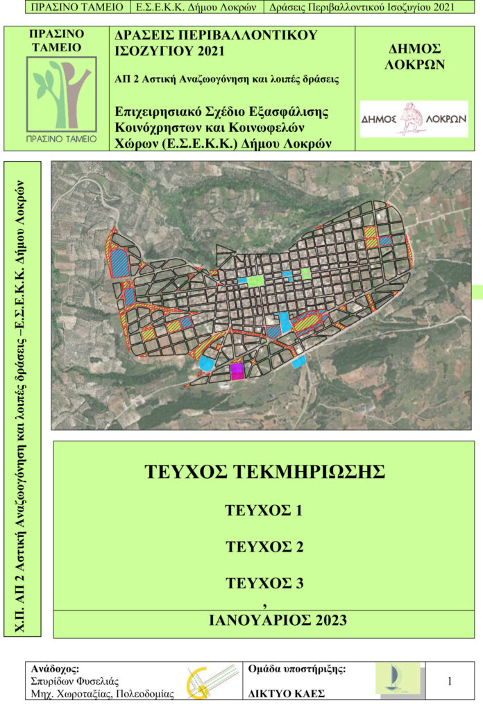 Ο Δήμος Λοκρών εντάχθηκε στο χρηματοδοτικό πρόγραμμα «Δράσεις Περιβαλλοντικού Ισοζυγίου 2021» του Πράσινου Ταμείου του του Άξονα Προτεραιότητας 2 (Α.Π.2) «Αστική Αναζωογόνηση και Λοιπές Δράσεις Περιβαλλοντικού Ισοζυγίου» με σκοπό να εκπονήσει Επιχειρησιακό Σχέδιο για την εξασφάλιση κοινόχρηστων και κοινωφελών χώρων – Ε.Σ.Ε.Κ.Κ. Δήμου Λοκρών», κατόπιν της απόφασης αριθ. 238.3.1/2022 (ΑΔΑ: Ψ9ΝΧ46Ψ844-Θ4Β) του Πράσινου Ταμείου. Το Επιχειρησιακό Σχέδιο εκπονήθηκε σύμφωνα με τις τεχνικές προδιαγραφές της υπ’ αριθμ. Οικ.ΥΠΕΝ/ΔΕΣΕΔΠ/57771/774/14-6-2021 Εγκυκλίου Τεχνικών Οδηγιών όπως τροποποιήθηκε με την υπ’ αριθμ. 54863/708/30-05-2022.