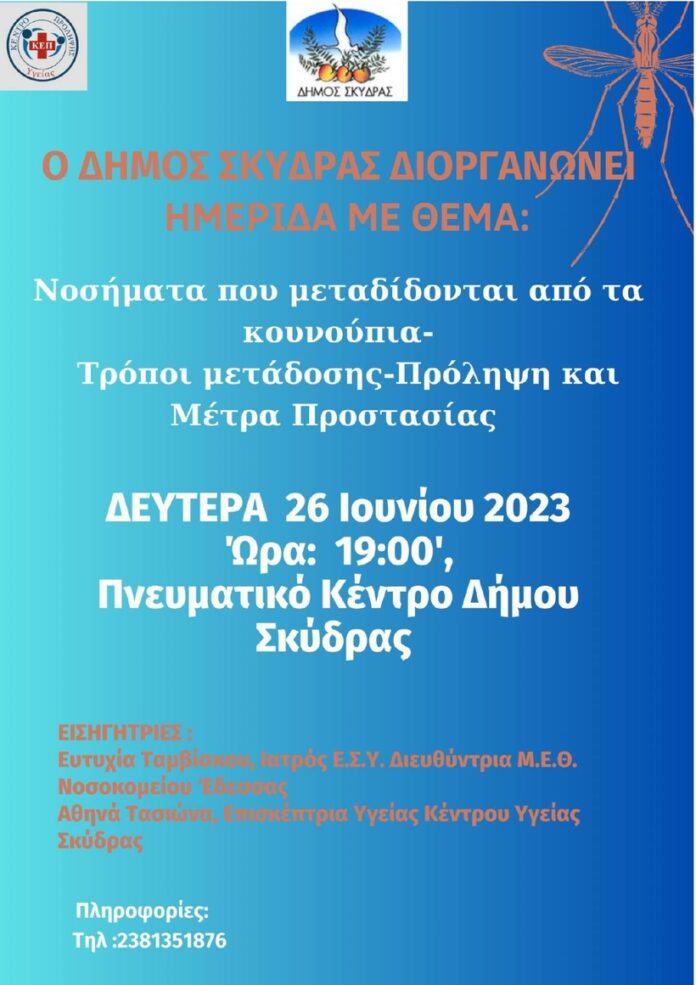 Η ημερίδα θα πραγματοποιηθεί στο Πνευματικό Κέντρο Δήμου Σκύδρας, τη Δευτέρα 26 Ιουνίου 2023 κι ώρα 19:00΄.