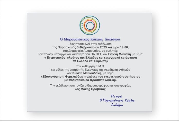 Εκδήλωση με θέμα «Ενεργειακός πλούτος της Ελλάδας και ενεργειακή κατάσταση σε Ελλάδα και Ευρώπη», με ομιλητές τον πρ. υπουργό και καθηγητή του Πανεπιστημίου Πειραιώς Γιάννη Μανιάτη και τον καθηγητή του Εθνικού Μετσόβειου Πολυτεχνείου και μέλος της Επιτροπής Ενέργειας της Ακαδημίας Αθηνών Κώστα Μαθιουδάκη, διοργανώνει ο «Μαρουσιώτικος Κύκλος Διαλόγου» με την υποστήριξη του Δήμου Αμαρουσίου στο Δημαρχείο Αμαρουσίου, την Παρασκευή 3 Φεβρουαρίου 2023 και ώρα 19:00.