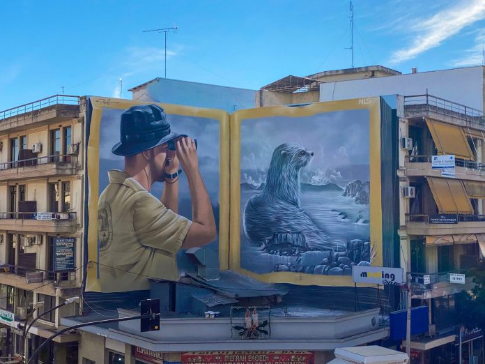 Ακόμη ένας (δύο, για την ακρίβεια) λευκοί τοίχοι κτισμάτων χρωματίστηκαν στα Τρίκαλα. Και μάλιστα με μια σύνθεση που συνδυάζει τη φύση και τον άνθρωπο. Πρόκειται για τον «Παρατηρητή» στη γωνία των οδών Ασκληπιού και Καποδιστρίου, το τρίτο κατά σειρά γκράφιτι που αλλάζει την όψη της πόλης, δίνοντας χρώμα και στιγμές της ζωής.