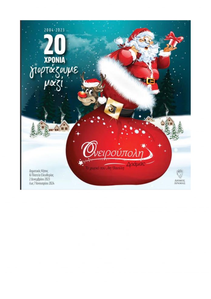 Η Ονειρούπολη Δράμας, το μεγαλύτερο χριστουγεννιάτικο χωριό στη Βόρεια Ελλάδα, ανοίγει τις πύλες του για 20η χρονιά, από το Σάββατο 2 Δεκεμβρίου 2023 έως και την Κυριακή 7 Ιανουαρίου 2024.