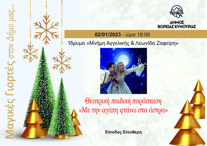 Στο πλαίσιο των Χριστουγεννιάτικων εκδηλώσεων 2022 του Δήμου Βόρειας Κυνουρίας τη Δευτέρα 2 Ιανουαρίου 2023 και ώρα 18:00, στο Ίδρυμα “Μνήμης Αγγελικής & Λεωνίδα Ζαφείρη”, θα προβληθεί η παιδική θεατρική παράσταση «Με την αγάπη φτάνω στα άστρα», από τον Θίασο Καρουζέλ.