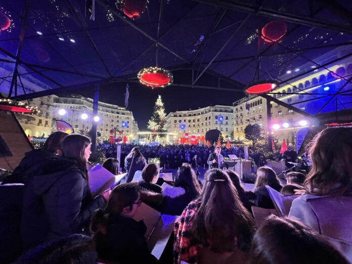 Με χριστουγεννιάτικες μελωδίες, τραγουδισμένες από τα μέλη παιδικών και νεανικών χορωδιών, πλημμύρισε απόψε (21/12) η πλατεία Αριστοτέλους.