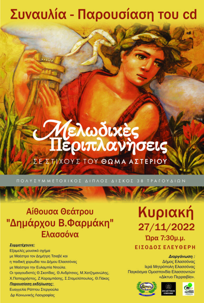 Ο Δήμος Ελασσόνας και η Αντιδημαρχία Πολιτισμού σε συνεργασία με την Παγκόσμια Ομοσπονδία Ελασσονιτών «Δίκτυο Περραιβία» και την Ιερά Μητρόπολη Ελασσόνας, διοργανώνουν μία υπέροχη συναυλία – παρουσίαση του cd «Μελωδικές περιπλανήσεις» του Ελασσονίτη στην καταγωγή στιχουργού Θωμά Αστερίου αυτή την Κυριακή 27 Νοεμβρίου 2022 στις 7:30μ.μ. στην αίθουσα Θεάτρου Δημάρχου Β.Φαρμάκη στην Ελασσόνα με ελεύθερη είσοδο.