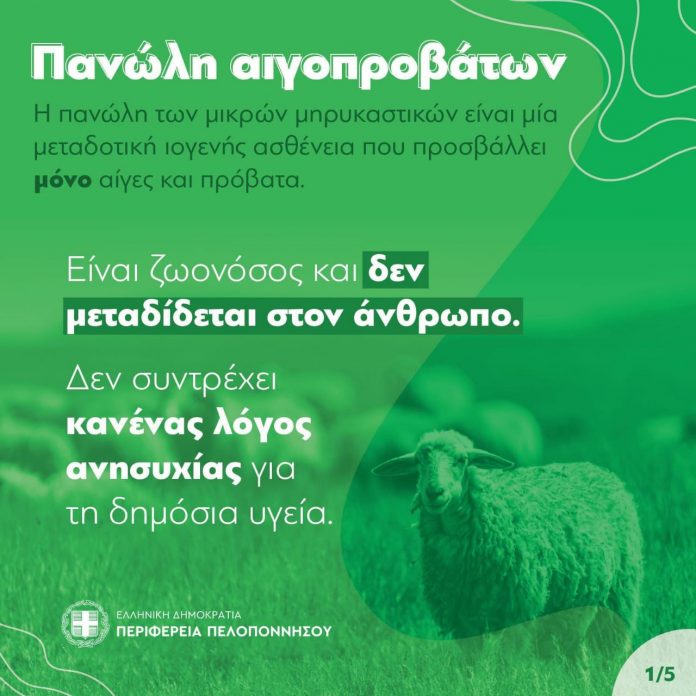 Στις 27/07/2024 επιβεβαιώθηκε η εμφάνιση εστίας Πανώλης Αιγοπροβάτων σε εκτροφή της ΠΕ Κορινθίας, στο Μεσινό του Δήμου Σικυωνίων. Πρόκειται για μεταδοτικό ιογενές νόσημα Υποχρεωτικής Δήλωσης που προσβάλλει μόνο τα πρόβατα και τις αίγες και απαιτεί την λήψη άμεσων έκτακτων μέτρων. Τονίζεται δε ότι είναι η πρώτη φορά που η νόσος εμφανίζεται στη χώρα μας.