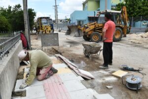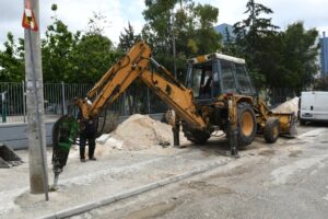 Στη συνέχεια έγινε επίσκεψη στην περιοχή περιμετρικά του 32ου Δημοτικού Σχολείου και του 11ου Γυμνασίου όπου γίνεται ανακατασκευή των πεζοδρομίων, ώστε να εξυπηρετούνται και οι ανάγκες προσβασιμότητας τυφλών και ατόμων με αναπηρία.