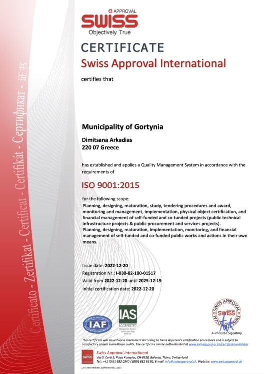 Ο Δήμος Γορτυνίας πλέον είναι εναρμονισμένος με ένα από τα πλέον γνωστά και ευρέως αποδεκτά πρότυπα ISO 9001, το οποίο χρησιμοποιούν περίπου 650.000 οργανισμοί σε 152 χώρες. Επιγραμματικά, η εφαρμογή Συστήματος Διαχείρισης της Ποιότητας, διασφαλίζει τη μείωση στα κόστη, βελτιώνει την επικοινωνία, σταθεροποιεί τις σχέσεις με τους δημότες και συνεργάτες. Η πιστοποίηση ισχύει μέχρι τον Δεκέμβριο 2025.