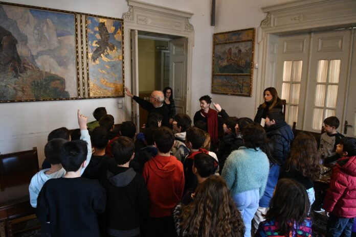 Οι μαθητές ενδιαφέρθηκαν και για τους πίνακες του πατρινού ζωγράφου Επαμεινώνδα Θωμόπουλου που κοσμούν τις αίθουσες του πρώτου ορόφου του κτιρίου και ο Αντιδήμαρχος μίλησε στα παιδιά για το ζωγράφο και τα έργα του.
