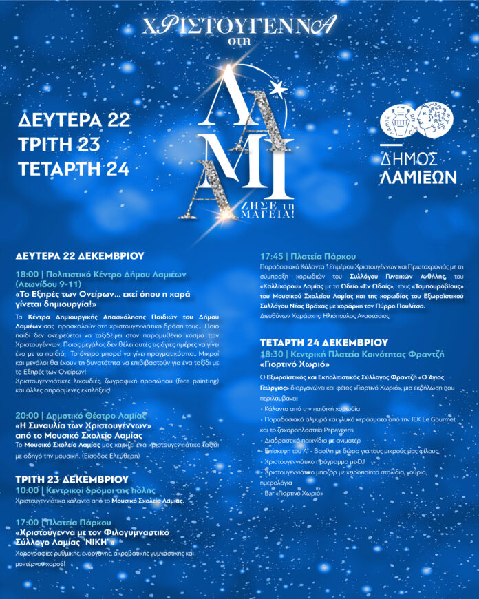 *Για περισσότερες πληροφορίες σχετικά με το πρόγραμμα των εορταστικών εκδηλώσεων μπορείτε να ενημερώνεστε από τον σύνδεσμο: https://lamia.gr/roi-eidiseon/lamia-gemati-fos-moysiki-kai-hamogela-xekinoyn-oi-hristoygenniatikes-ekdiloseis