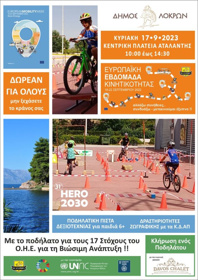 Η ποδηλασία αποτελεί ένα από τα πλέον ανερχόμενα αθλήματα στην Ελλάδα και ο κόσμος αγκαλιάζει το ποδήλατο ως μέσο άθλησης, ψυχαγωγίας και οικολογικής μετακίνησης. Στο πλαίσιο της Ευρωπαϊκής Εβδομάδας Κινητικότητας ο Δήμος Λοκρών, σε συνεργασία με το HERO 2030 και την οργανωτική υποστήριξη της enzyme, προσκαλεί τα παιδιά την Κυριακή 17 Σεπτεμβρίου 2023 και ώρα 10:00 π.μ. στην Πλατεία Αταλάντης να συμμετάσχουν δωρεάν στην ποδηλατική πίστα δεξιοτεχνίας.