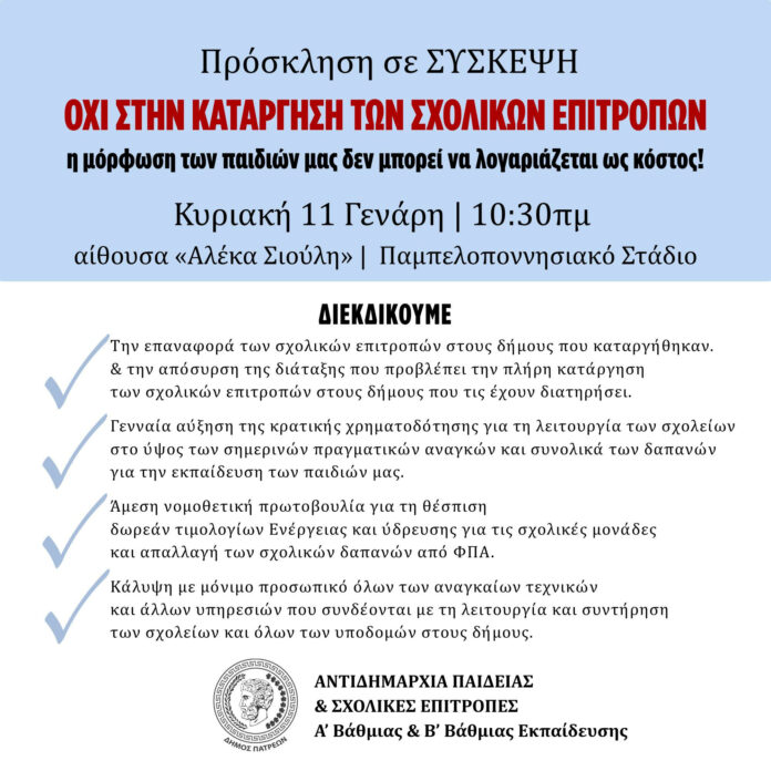 Η Αντιδημαρχία Παιδείας και οι Πρόεδροι των Σχολικών Επιτροπών Πρωτοβάθμιας και Δευτεροβάθμιας Εκπαίδευσης του Δήμου Πατρέων καλούν Διευθυντές και Συλλόγους Διδασκόντων, Συλλόγους Γονέων και Συνδικαλιστικούς Φορείς Εκπαιδευτικών σε σύσκεψη την Κυριακή 11 Γενάρη στις 10:30 π.μ. στην αίθουσα «Αλέκα Σιούλη» στο Παμπελοποννησιακό Στάδιο, με αφορμή την σχεδιαζόμενη κατάργηση των Σχολικών Επιτροπών στο υπό διαβούλευση νομοσχέδιο του Υπουργείου Εσωτερικών (ΥΠΕΣ).