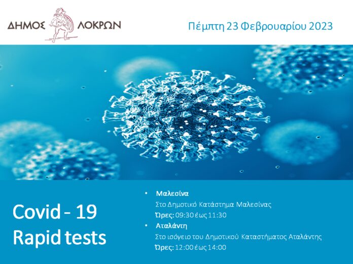Απευθύνουμε πρόσκληση συμμετοχής σε δωρεάν rapid tests Covid-19 στο Δήμο Λοκρών, σε συνεργασία με τον Εθνικό Οργανισμό Δημόσιας Υγείας (ΕΟΔΥ) Φθιώτιδας, για πεζούς και χωρίς ραντεβού ως εξής: