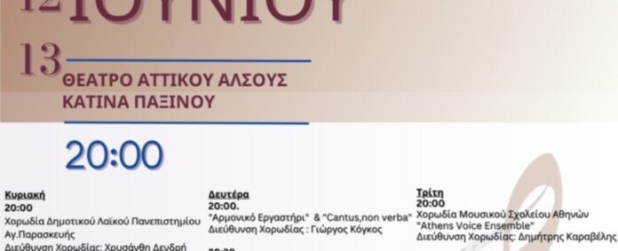 Η Περιφέρεια Αττικής κατόπιν σχετικής πρωτοβουλίας του Περιφερειάρχη Γ. Πατούλη διοργανώνει το 1ο Φεστιβάλ Χορωδιών Περιφέρειας Αττικής στις 11- 12 και 13 Ιουνίου στο θέατρο Αττικό Άλσος «Κατίνα Παξινού».