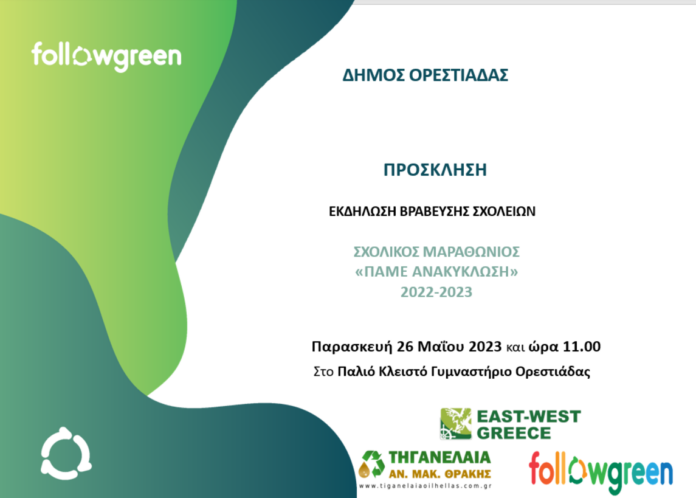 Ο Δήμος Ορεστιάδας διοργανώνει γιορτή ανακύκλωσης την Παρασκευή 26 Μαΐου 2023 για τη βράβευση του Σχολικού Μαραθωνίου Ανακύκλωσης στο πλαίσιο της δημοτικής πλατφόρμας ανακύκλωσης Followgreen.