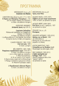 Η είσοδος είναι ελεύθερη και το πρόγραμμα έχει διάρκεια 70 λεπτών και περιλαμβάνει θέματα αρχαιοελληνικής και παραδοσιακής μουσικής, σε εναλλαγή με έργα των Gluck, Debussy, Ravel, Bartók, Ibert, Shankar, Αντωνίου, Βαρότση.