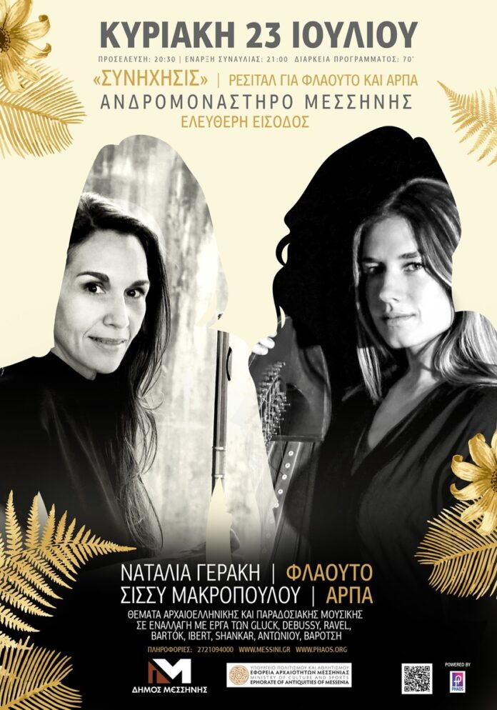 Ρεσιτάλ για φλάουτο και άρπα με τίτλο «Συνήχησις» θα πραγματοποιηθεί την Κυριακή 23 Ιουλίου 2023 και ώρα 21:00 στο Ανδρομονάστηρο Μεσσήνης. Η Ναταλία Γεράκη και η Σίσσυ Μακροπούλου, σολίστ με διεθνή παρουσία, θα συμπράξουν σε μια μυσταγωγική συνήχηση που θα λάβει χώρα στον αύλειο χώρο της βυζαντινής μονής. Εκεί, μπροστά στην κεντρική πύλη του ναού, ανάμεσα στους πύργους και τα κελιά του μοναστηριού, η συνήχηση του διονυσιακού Φλάουτου και της απολλώνιας Άρπας θα μας ταξιδέψουν μουσικά σε έναν κόσμο όπου παραδόσεις ελληνικές, ισπανικές, γαλλικές, ρουμάνικες, εβραϊκές, ινδικές, συμπλέκονται με μύθους αρχαιοελληνικούς και θρήνους μανιάτικους.