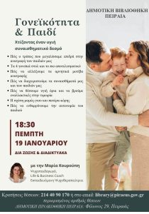 Σεμινάριο με θέμα: «Γονεϊκότητα και Παιδί, Χτίζοντας έναν υγιή συναισθηματικό δεσμό»,  θα πραγματοποιηθεί  την Πέμπτη 19 Ιανουαρίου, στις 18:30, στη Δημοτική Πινακοθήκη Πειραιά, (Φίλωνος 29),  σε συνέχεια του επιτυχημένου κύκλου σεμιναρίων που πραγματοποιήθηκαν το περασμένο έτος, σε συνεργασία με τη Δημοτική Βιβλιοθήκη Πειραιά.