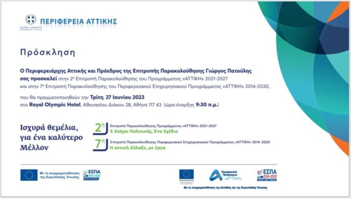Ο Περιφερειάρχης Αττικής και Πρόεδρος της Επιτροπής Παρακολούθησης Γιώργος Πατούλης  προσκαλεί τα μέλη των επιτροπών και τους πολίτες στη  2η Επιτροπή Παρακολούθησης του Προγράμματος «ΑΤΤΙΚΗ» 2021-2027 και την 7η Επιτροπής Παρακολούθησης του Περιφερειακού Επιχειρησιακού Προγράμματος «ΑΤΤΙΚΗ» 2014-2020.
