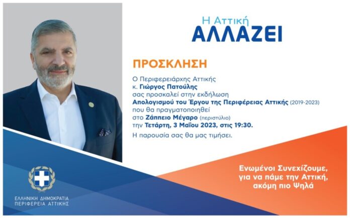 Παρουσία του Πρωθυπουργού Κυριάκου Μητσοτάκη,  την Τετάρτη, 3 Μαΐου 2023, στις 19:30, ο Περιφερειάρχης Αττικής κ. Γιώργος Πατούλης θα παρουσιάσει στο Ζάππειο Μέγαρο (περιστύλιο) τον απολογισμό του Έργου της Περιφέρειας Αττικής.