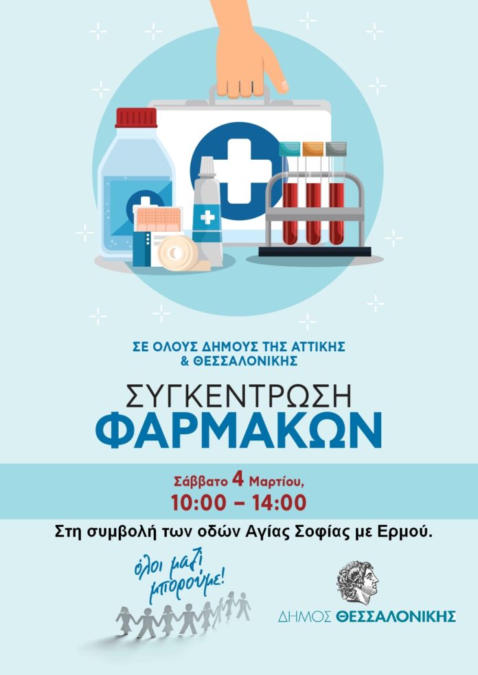 Η Διεύθυνση Κοινωνικής Προστασίας και Δημόσιας Υγείας του Δήμου Θεσσαλονίκης σε συνεργασία με το ΟΛΟΙ ΜΑΖΙ ΜΠΟΡΟΥΜΕ διοργανώνουν δράση συγκέντρωσης φαρμάκων και υγειονομικού υλικού για τα Κοινωνικά Φαρμακεία. Η δράση θα πραγματοποιηθεί το Σάββατο 4 Μαρτίου, από τις 10:00 έως τις 14:00, στη συμβολή των οδών Αγίας Σοφίας με Ερμού.