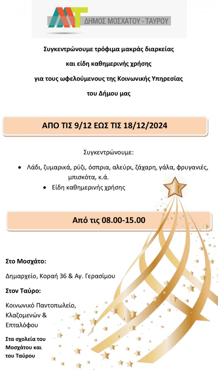 Ο Δήμος Μοσχάτου-Ταύρου ενόψει των εορτών των Χριστουγέννων καλεί τους πολίτες να συμμετέχουν στη δράση της συγκέντρωσης τροφίμων και ειδών καθημερινής χρήσης για τους ωφελούμενους των προγραμμάτων των κοινωνικών υπηρεσιών του Δήμου και για την ενίσχυση του κοινωνικού παντοπωλείου.