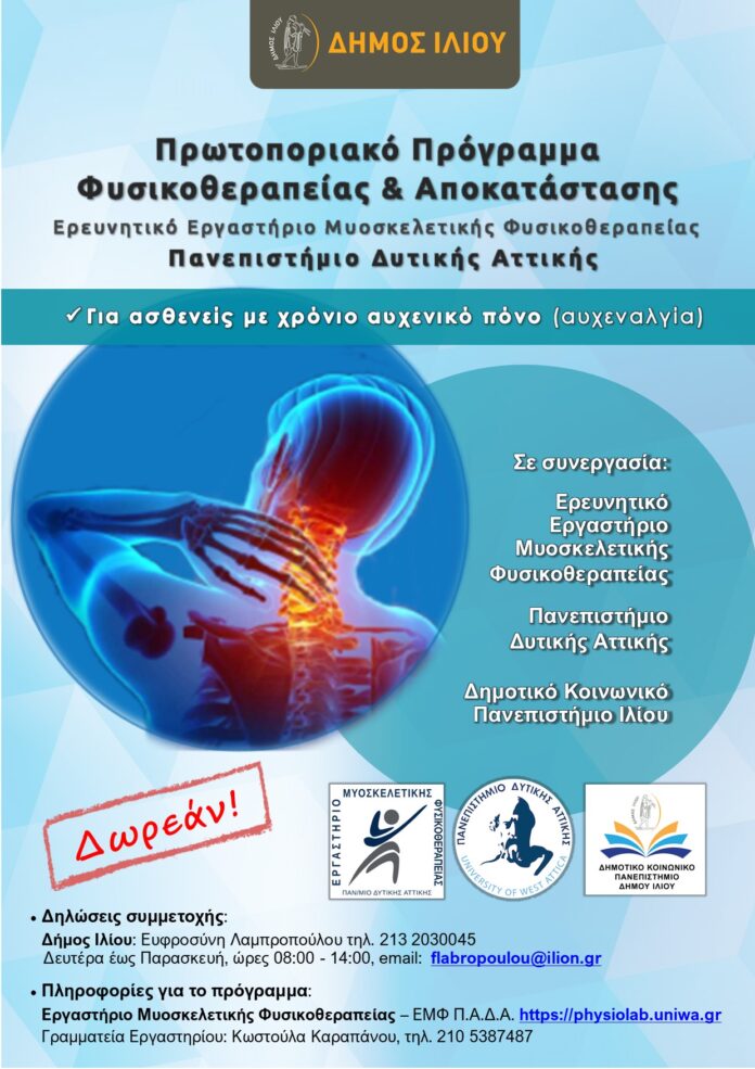 Η παράταση αφορά πρόγραμμα που απευθύνεται σε ασθενείς με χρόνιο αυχενικό πόνο (αυχεναλγία), ηλικίας 18 – 70 ετών, το οποίο περιλαμβάνει ατομικές συνεδρίες, κατόπιν ιατρικής διάγνωσης και φυσικοθεραπευτικής αξιολόγησης από το Ερευνητικό Εργαστήριο Μυοσκελετικής Φυσικοθεραπείας του Πανεπιστημίου, με στόχο τη μείωση του πόνου και τη βελτίωση της λειτουργικότητας των συμμετεχόντων.