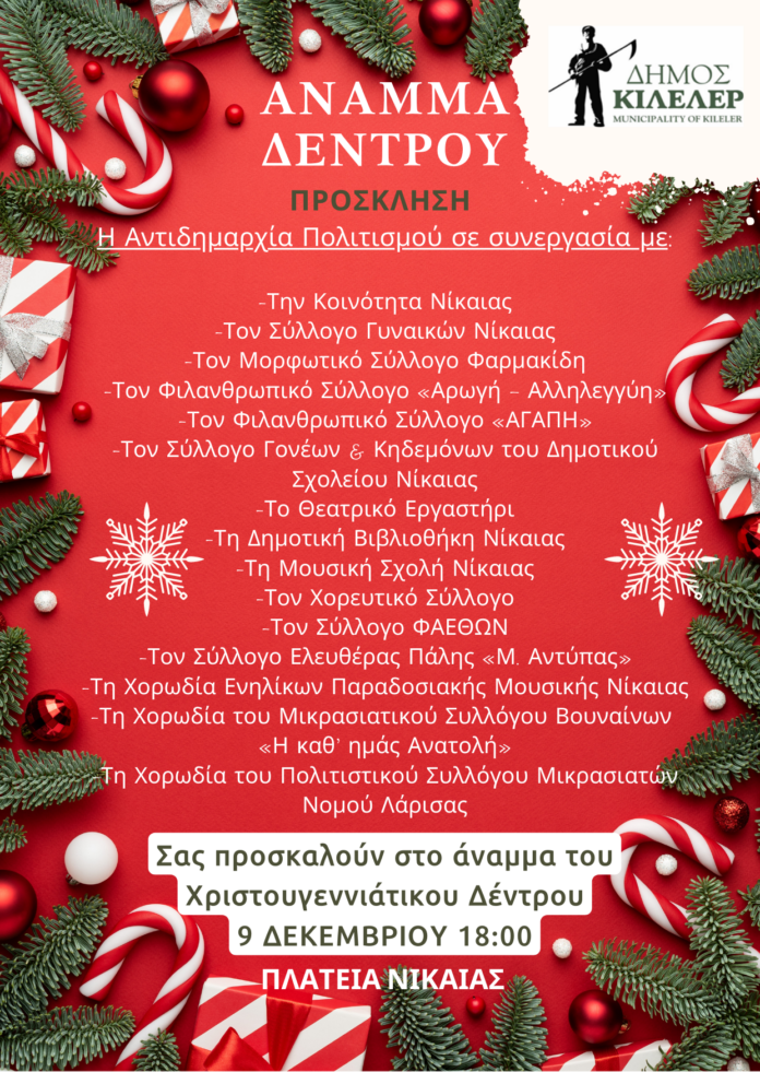 Την Παρασκευή 9 Δεκεμβρίου στις 18:00  στη Νίκαια στις 18:00, στο άναμμα του χριστουγεννιάτικου δέντρου  θα εμφανιστούν οι χορωδίες Ενηλίκων Παραδοσιακής Μουσικής Νίκαιας, Μικρασιατικού Συλλόγου Βουναίνων «Η κάθ’ ημάς Ανατολή» και Πολιτιστικού Συλλόγου Μικρασιατών Νομού Λάρισας, η Φιλαρμονική του Δήμου Κιλελέρ,  και η Ορχήστρα της Μουσικής Σχολής.  Χριστουγεννιάτικα κεράσματα και εδέσματα θα προσφέρει ο Φιλανθρωπικός Σύλλογος «Αρωγή – Αλληλεγγύη», ο Σύλλογος Γυναικών Νίκαιας και ο Φιλανθρωπικός Σύλλογος «Αγάπη».  Το παραδοσιακό ζεστό χριστουγεννιάτικο κρασί θα προσφέρουν μέλη του Μορφωτικού Λαογραφικού Συλλόγου «Θεόκλητος Φαρμακίδης». Χριστουγεννιάτικο μπαζάρ  από  το Σύλλογο Γονέων και Κηδεμόνων του Δημοτικού Σχολείου Νίκαιας.