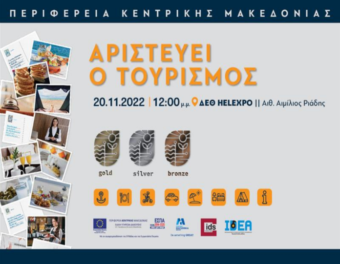 Εκδήλωση απονομής των πρώτων βραβείων «Τουριστικής Αριστείας» διοργανώνει την Κυριακή 20 Νοεμβρίου 2022 στο πλαίσιο της φετινής «Philoxenia» η Περιφέρεια Κεντρικής Μακεδονίας. Στην εκδήλωση, που θα πραγματοποιηθεί στην αίθουσα Αιμίλιος Ριάδης της ΔΕΘ-HELEXPO στις 12 το μεσημέρι, θα γίνει η παρουσίαση του Σήματος Υπευθυνότητας – Τοπικής Ποιότητας, για το οποίο διαγωνίστηκαν για πρώτη φορά σε όλη την τουριστική σεζόν του 2022 εκατοντάδες τουριστικές επιχειρήσεις από τις επτά περιφερειακές ενότητες της Κεντρικής Μακεδονίας. Στη συνέχεια της εκδήλωσης θα επακολουθήσει η βράβευση των επιχειρήσεων που έχουν διακριθεί στο θεσμό της «Τουριστικής Αριστείας» για το 2022.